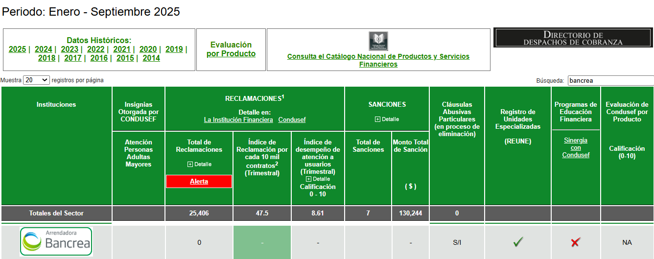 El Buró de Entidades Financieras contiene información de Banco Bancrea S.A. IBM y Arrendadora Bancrea, S.A. de C.V. SOFOM, E.R , sobre las características de nuestros productos y nuestro desempeño frente a los Usuarios en la prestación de servicios.